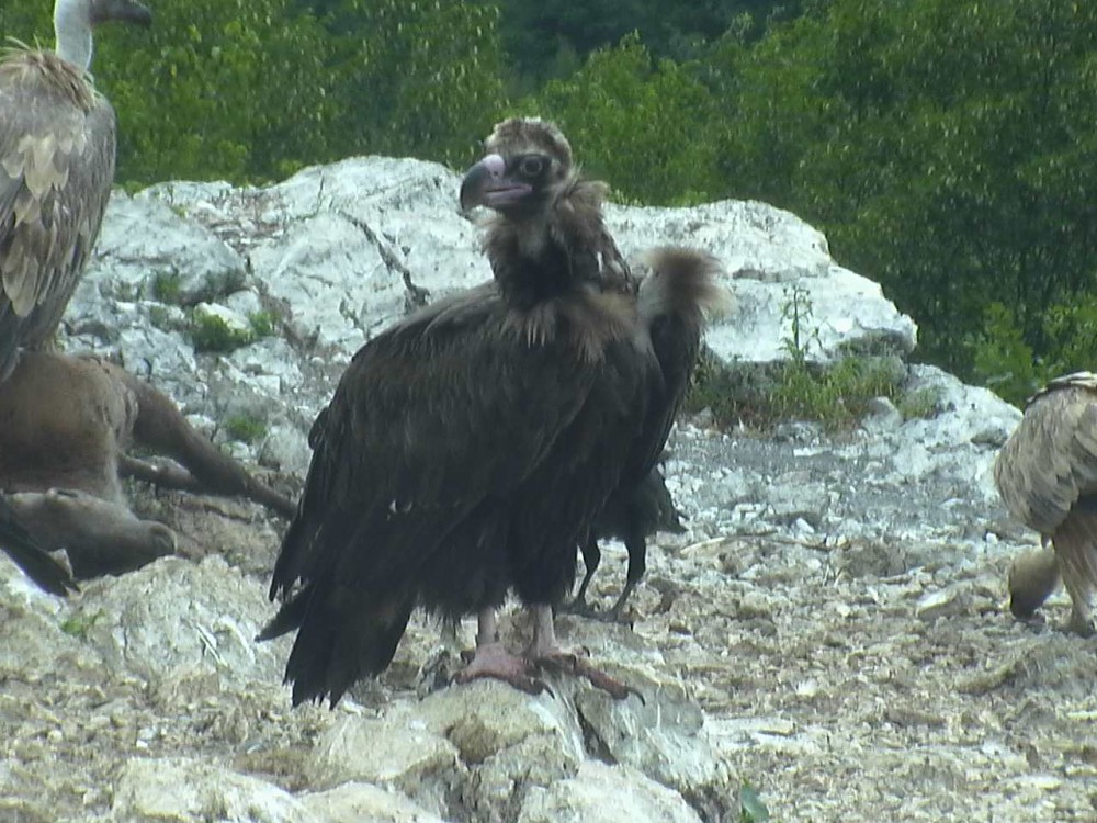 Depuis début juillet, 3 vautours moines fréquentent un site de nourrissage du Nord Est de l'Italie, parmi environ 200 vautours fauves.