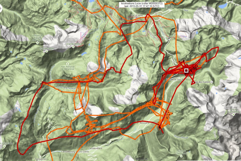 Bien que tous les troupeaux d’ovins ne soient pas encore en alpage, les premiers vautours commencent à être observés en Haute Maurienne. C’est le cas de Lucie, une femelle Vautour moine lâchée dans les gorges du Verdon en septembre 2014. Elle a été observée en vol le 31 mai dernier à 2 400 m d’altitude (identifiée grâce à ses décolorations alaires), sur la commune de Lanslevillard (73). Ci-contre la carte de ses déplacements.