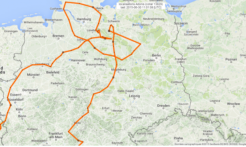 – Le 7/06, il arrive en Allemagne. En moins de deux jours, il atteint la pointe Nord du pays, où il effectue une première boucle autour d’Hambourg et une seconde boucle autour de Wittenberge.