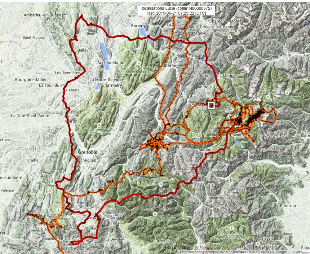 Le 20 juin, elle est partie vers le Nord jusqu’au Bugey puis a bifurqué à l’Est vers le Beaufortain pour ensuite redescendre en Vanoise et passer la nuit à Champagny soit un second trajet de 368 km en une journée !
