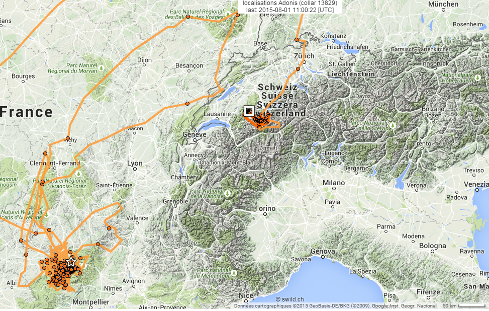 Son congénère Adonis a, quant à lui, rejoint les Alpes mi-juin dernier. Malheureusement, sa balise GPS a cessé de transmettre des données depuis début août ; un disfonctionnement au niveau de la recharge de l’émetteur serait à l’origine de ce problème technique. Le 1er août, il était toujours présent dans le Canton de Berne (Suisse occidentale), secteur où d’autres individus issus de réintroduction dans les Alpes sont aussi observés.