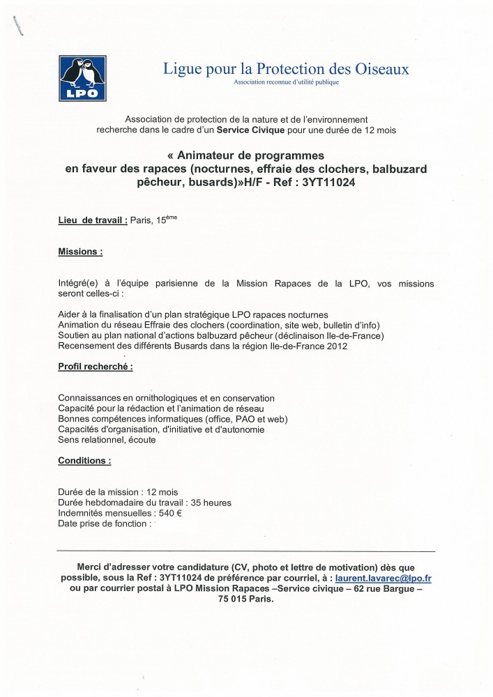 La LPO Mission Rapaces à Paris recherche activement un service civique volontaire ayant comme intitulé « Animateur de programmes en faveur des rapaces ». Plus précisemment, les sujets concernés seront les rapaces nocturnes de manière générale, ainsi que le Balbuzard pêcheur et les Busards en région Ile-de-France. Voici l’offre pour plus de détails : Offre Service Civique Volontaire Paris.PDF. D’autres thèmes seront abordés par la suite. Nous recruterons une personne dès que possible. Pour postuler à cet offre, merci d’adresser votre candidature (CV et lettre de motivation) sous la référence 3YT11024 de préférence par courriel à laurent.lavarec@lpo.fr ou par courrier postal à la LPO Mission Rapaces 62 rue Bargue 75 015 Paris.