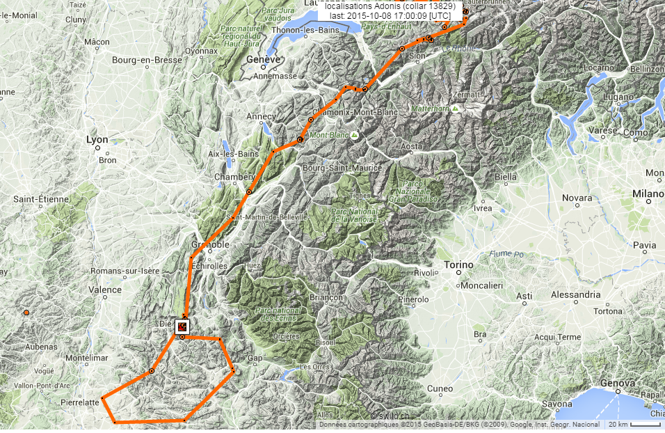 En effet, le 29 septembre, il a atteint directement les Pré-Alpes : il a survolé les Baronnies drômoises avant de se fixer quelques jours dans PNR du Vercors (il stationne notamment dans le cirque d’Archiane). Il finit par rejoindre les Baronnies drômoises, où il est aujourd’hui toujours présent. A partir du 8 octobre dernier, sa balise GPS a de nouveau cessé d’émettre des données. Mais Adonis est régulièrement observé par les salariés de l’association Vautours en Baronnies.