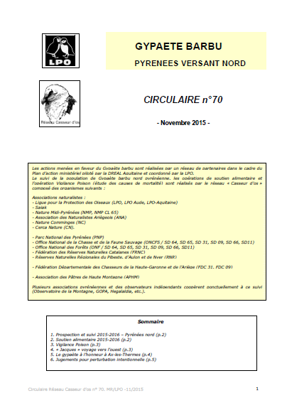Sont abordés : la prospection et le suivi 2015-2016 (Pyrénées nord), le soutien alimentaire pour 2015-2016, l’opération Vigilance-Poison, les déplacements de « Jacques » vers l’ouest, la conférence et l’exposition qui ont mis le Gypaète à l’honneur à Ax-les-Thermes, et les récents jugements pour perturbation intentionnelle.