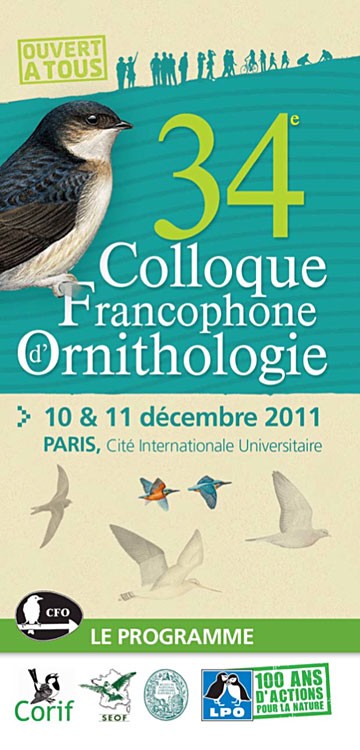 Le 34e Colloque Francophone d’Ornithologie aura lieu les 10 et 11 décembre 2011 à Paris à la Cité internationale universitaire. Le programme comprend 6 sessions : La forêt, les hirondelles, l’outre-mer, la conservation, les études et enquêtes puis le futur.