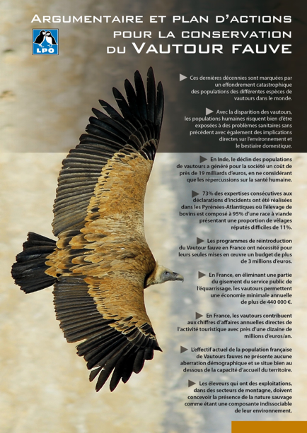 With the support of different wildlife protection groups, the LPO has outlined the position that it hopes to defend for the project, developed by the Ministère de l’Ecologie, du Développement Durable, des Transports et du Logement [France’s Ministry for Ecology, Sustainable Development, Transport and Housing] and managed by the ONCFS [France’s National Office for Hunting and Wild Fauna], of drawing up an action plan for griffon vultures. This document is built around an opening series of supporting arguments followed by an action plan to preserve griffon vultures, which could form a central guideline that the different conservation initiatives developed locally make a reality. For the supporting arguments, the petitioners used information and tools designed to increase awareness about the roles played and services provided by vultures so that the birds could be better understood, as well as producing an improved assessment of the level of vultures’ contribution to and responsibility in events that affect certain herds of farmed livestock.