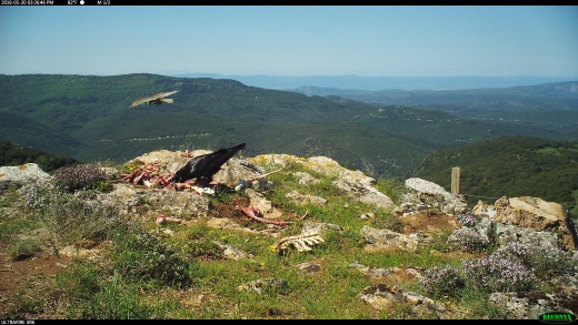Le site de nourrissage en fonction depuis le 15 mars au coeur des Corbières créé dans le cadre du Life a eu pour la première fois la visite d’un Gypaète. Très probablement l’adulte qui séjourne de façon quasi permanente sur le secteur et qui passe ses nuits sur une falaise à 4.5 km. Ci joint la seule photo ou on le voit partir avec un os sans doute récupéré en dehors de l’enclos.