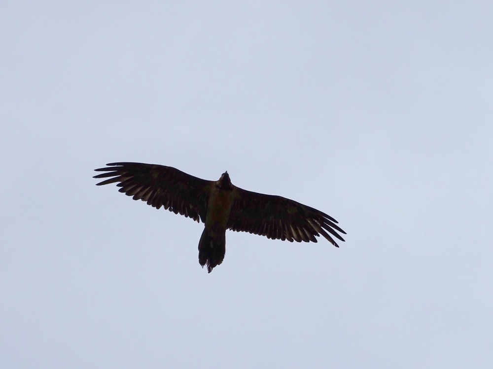 « J’étais en train de marcher, lorsque je me suis retourné et que j’ai vu arriver droit sur moi un Gypaète barbu en vol. Il était 11h05 environ. L’oiseau m’a tourné rapidement au-dessus, me permettant ainsi de prendre une photo, puis il est parti un peu plus au Sud, derrière un petit relief, en disparaissant de mon champ de vision. Tout émoustillé, je me suis dirigé rapidement dans la même direction tout en me tenant prêt à appuyer de nouveau sur le déclencheur de mon appareil.