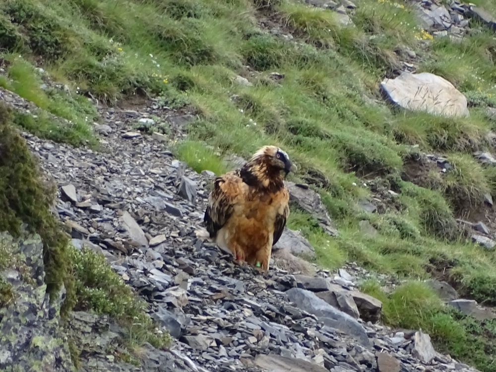 Cardabelle (Gypaète barbu de 5ème année) a pu être identifiée grâce à ses bagues (Tarse droit : rouge – Tarse gauche : argent et vert).