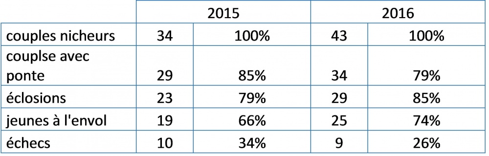 Cette année, 43 couples ont été observés nicheurs soit 9 de plus que l’an dernier! Un total de 34 pontes se sont produites (5 de plus que l’an dernier), et 25 poussins se sont envolés avec succès, 6 de plus que l’an dernier.