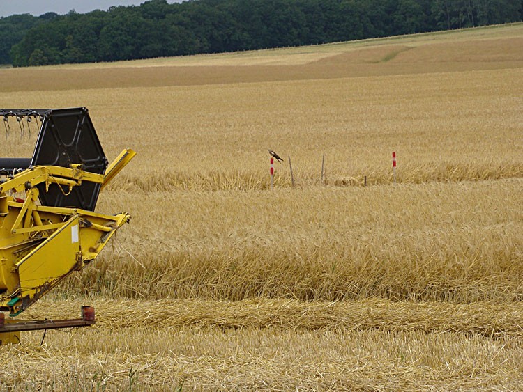 Les moissons ont commencé. Les nids de busards repérés ont pu être protégés, avec l’accord des agriculteurs. Ici, une femelle perchée sur un des piquets de l’enclos de protection, voit avec inquiétude la moissonneuse s’approcher.