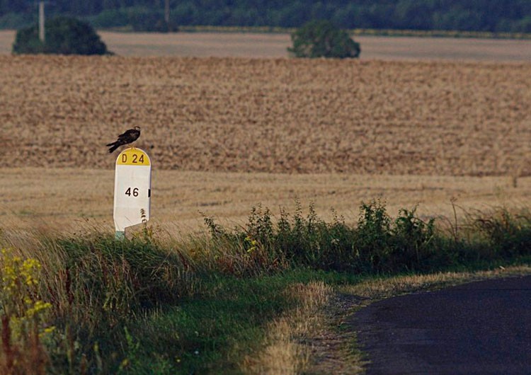 Une femelle de busard cendré posée sur une borne kilométrique, semble hésiter avant d’entreprendre la grande route vers les sites d’hivernage, au sud du Sahara.