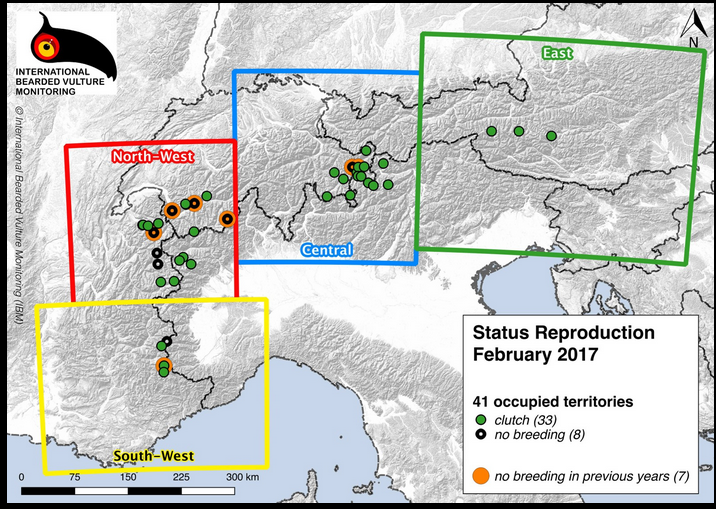Actuellement, nous nous trouvons en pleine saison de reproduction chez les Gypaètes barbus. 41 sites sont occupés dans l’ensemble de l’arc alpin et touchent 4 pays : 3 couples en Autriche, 17 couples en Suisse, 8 couples en Italie et 13 couples en France.