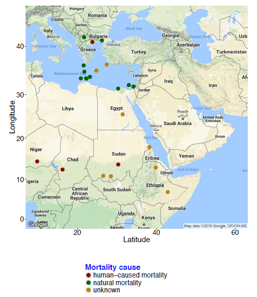 L’étude montre que la mauvaise navigation lors du survol de la Méditerranée représente la plus grande cause de mortalités des jeunes (43%). Six oiseaux sont morts de causes inconnus mais au moins 3 ont été abattus.