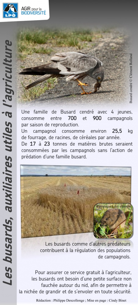 L’argumentaire souligne plus particulièrement les bénéfices apportés par les busards à l’agriculture via la régulation des populations de campagnols. La plaquette est fournie sous pdf.