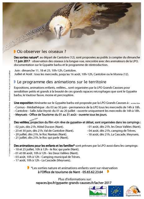 Avec l’arrivée des beaux jours, et surtout avec l’arrivée de nouveaux individus gypaètes dans les Grands Causses, l’équipe de la LPO Grands Causses vous propose plusieurs rendez-vous pour profiter autant du beau temps que de la Nature.