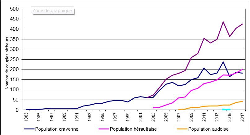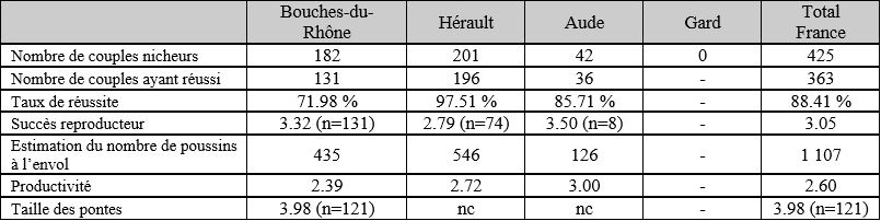 Les résultats de la reproduction en France en 2017 sont indiqués dans le tableau et la figure ci-contre. L’effectif nicheur de la population française est de 425 couples en 2017 soit une augmentation de 5.20 % par rapport à l’année dernière (404 couples). Le nombre de jeunes à l’envol est de 1 107 poussins.