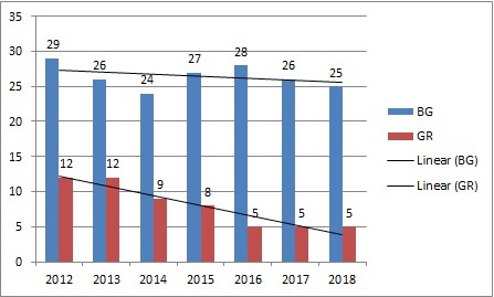 The first results from the monitoring of the species in Bulgaria and Greece show similar tendency in the number of occupied territories and the number of pairs compared to 2017. The number of occupied territories is 25 for Bulgaria (19 in the Rhodopes and 6 in northern Bulgaria) and 6 in Greece (3 in Dadia Forest reserve, 1 in Kompsatos area and 2 in Central Greece) (Figure 1). The number of pairs in Greece hasn‘t changed in the last 5 years (5 pairs) while it has slightly decreased in Bulgaria (down to 25 in 2018)(Figure 2). However, the status of some breeding territories of the speies is still not confirmed and we expect good breeding season and increase in the number of occupied territories and the number of pairs in the next phase of the monitoring.