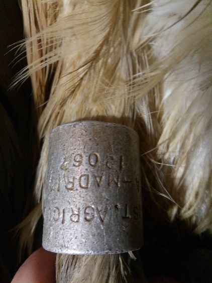 Identification de Silvano : pas de plume décolorée, pas de marque alaire ni émetteur, mais une plume de l’aile gauche relevée vers le haut + sa bague métal Madrid.