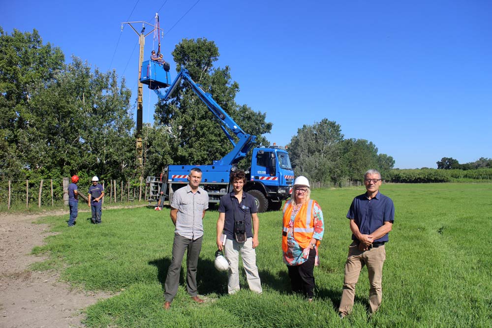 Au Sambuc, dans le Parc naturel régional de Camargue, une équipe de techniciens d’Enedis spécialisée dans les travaux sous tension (TST) installe des protections avifaunes sur une ligne moyenne tension pour protéger les différentes espèces d’oiseaux du secteur.