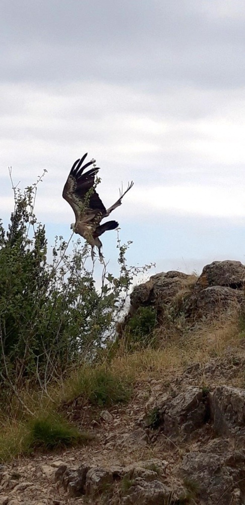 Après 2 jours d’acclimatation dans une volière avec vue sur la colonie de vautours, et un bon repas, Cadalen s’envola le 11 août en prenant immédiatement une ascendance thermique pour rejoindre plusieurs centaines de ses congénères. Le tout sous le regard du Vautour percnoptère local qui regardait l’arrivée de ce nouveau venu alors que lui-même préparait ses bagages pour l’Afrique…