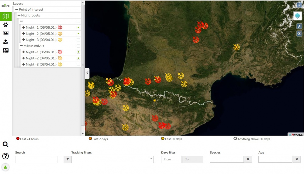 Alors que des centaines d’observateurs étaient mobilisés ce weekend pour participer au comptage européen des dortoirs de milans royaux, des confrères tchéco-autrichiens ont eu la gentillesse de partager avec le réseau européen Milan royal leurs données de milans royaux équipés de balises GPS. Ainsi, 14 milans royaux étaient présents dans des dortoirs en France pendant le comptage : 9 dans les Pyrénées (Pyrénées-Atlantiques, Hautes-Pyrénées, Haute-Garonne et Ariège), 4 dans le Cantal et 1 en Ardèche. Grâce à ces données, au moins un nouveau dortoir a été découvert.