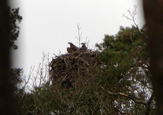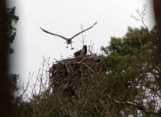 Puis c’est au tour de Gilles Perrodin, le vendredi 28 février, de nous faire partager ses observations sur un autre nid proche : « Un couple est venu se poser sur le nid vers 15H15, apparemment au passage d’un intrus. Le mâle tenait un poisson entamé. Il est reparti avec le poisson peu après et la femelle est restée crier de temps en temps sur le nid. Elle a décollé vers 15H35 et aussitôt après, j’ai vu un oiseau en poursuivre un autre à toute vitesse entre les arbres. D’après les informations de Alain Desbrueres que j’ai retrouvé un moment après à l’observatoire, il est possible que ce soit Panchita qui est venue perturber le couple de ce nid dont la femelle habituelle est peut-être déjà arrivée (mes photos sont trop mauvaises pour bien voir comment était baguée la femelle qui a décollé du nid…).