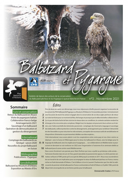 Au sommaire de ce numéro : le retour du Balbuzard pêcheur en Alsace ; quelques mots sur le passage de pygargues balisés dans le nord de la France ; zoom sur la collaboration franco-belge pour le baguage du balbuzard en France continentale ; exemples d’aménagements réalisés en 2021 en faveur du balbuzard ; récit d’un balbuzard pêcheur rescapé en région Centre ; retour sur la gestion du dérangement dans le cadre d’une opération de démoustication en Alsace ; synthèse des comptages et observations des balbuzards dans le nord Sénégal pour la saison d’hivernage 2020 ; des nouvelles du projet balbuzard suisse ; la revue de deux articles sur le pygargue dans le dernier CICONIA ; des expositions itinérantes et permanentes dédiées au balbuzard en France….