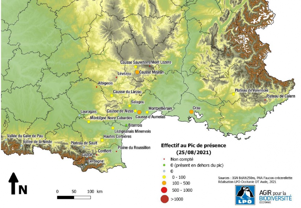 La LPO Occitanie DT Aude est en charge de la coordination de l’action au niveau national. Cette année, suite à la réduction de l’enveloppe budgétaire du PNA Faucon crécerellette rendant un suivi hebdomadaire inenvisageable, il a été décidé de réaliser un seul comptage simultané à la date du pic de présence de l’espèce (fin août). Le comptage simultané réalisé le 25 août 2021 a permis de dénombrer 1255 individus. Ce suivi a été effectué bénévolement par des associations naturalistes et/ou par des ornithologues bénévoles sur l’ensemble du sud de la France.