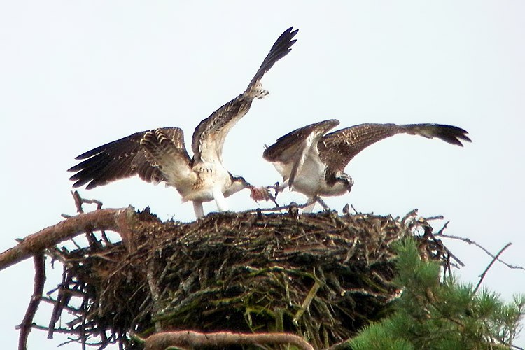 Trois jeunes balbuzards ont pris leur envol cette année sur le nid de l’étang du Ravoir en forêt d’Orléans. Le premier s’est envolé le 7 juillet et les trois jeunes sont toujours présents et bien visibles début août. Les deux adultes apportent les poissons que les jeunes mangent sur l’aire ou emportent dans un arbre voisin.