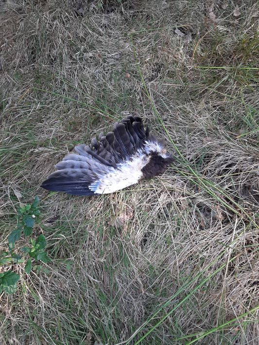 Une dizaine de mètres plus loin, c’est l’aile de l’aîné, un individu clair que je retrouve sectionnée à sa base et mâchée également. Son état de conservation ne laisse pas davantage de doute sur une prédation récente. Je constate également la présence de fèces de Martres des pins (Martes martes) anciennes et récentes pouvant laisser présumer de la prédation ou tout au moins de la consommation des poussins par le mustélidé.