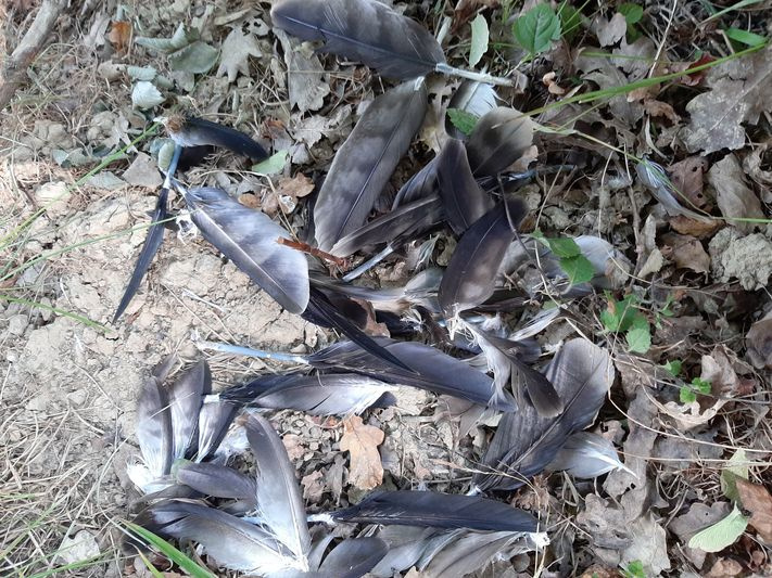 Pressentant la disparition des poussins, j’effectue un nouveau passage sur le site le 28 juillet en fin d’après-midi et bien équipé cette fois. Rapidement, je découvre au pied de l’arbre porteur de l’aire la plumée d’un poussin : les rachis sectionnés ne laissent aucun doute quant à sa consommation et probablement sa prédation par un petit carnivore.
