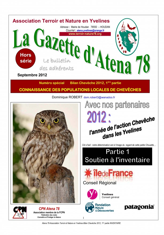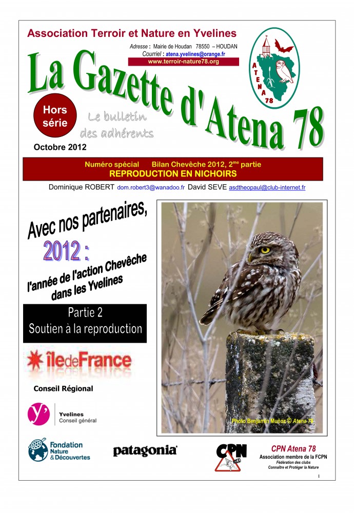 Je vous joins le bilan annuel Chevêche 2012 d’ATENA 78, association de protection de la Nature se situant dans les Yvelines.