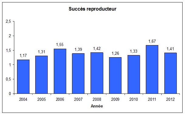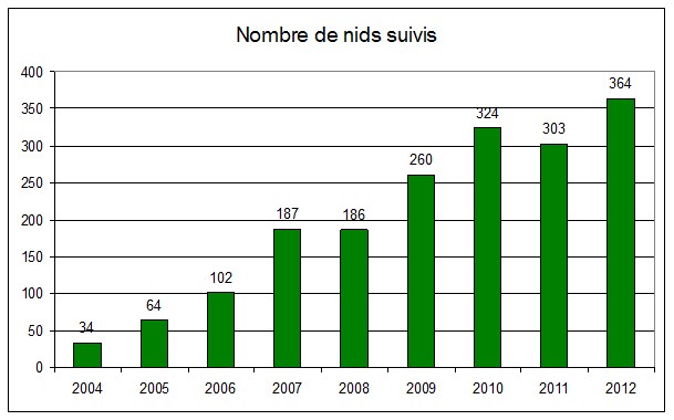 Au final, 364 cas de nidification auront été suivis en 2012. Ces 364 couples ont produits 515 jeunes à l’envol soit un taux moyen de 1,41 jeune/cple, c’est-à-dire une reproduction dans la moyenne de ces dernières années.