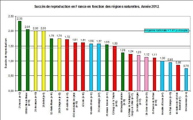Le bilan de la reproduction en 2012 ressemble bigrement à un bulletin météo : ensoleillé au nord, nuageux au sud et variable au centre. La reproduction a en effet été bonne à excellente dans les plaines du nord-est de la France avec notamment le cas de la Côte d’Or et de la Lorraine qui ont une production remarquable. Rappelons que la Lorraine a vu l’envol de 2 nichées à 4 jeunes. C’est un peu moins vrai en Alsace et plus précisément dans le Sungdau alsacien. Le bilan est également très positif en Franche-Comté y compris dans le Bassin du Drugeon où la productivité est généralement inférieure à 1,5 juv/cple alors qu’elle atteint 1,75 juv/cple cette année. Dans le Massif central, la productivité est inférieure à celle de 2011 qui avait été excellente. Le bilan est quand même négatif dans certaines zones d’étude comme les gorges de la Truyère, la plaine de Paulhaguet et surtout la Lozère où la différence est nette par rapport à ces 2 dernières années. En Corse, l’année 2012 est l’une des plus mauvaises depuis le début du suivi. Enfin, dans les Pyrénées, il faut noter la bonne mobilisation des observateurs. La reproduction est conforme au schéma habituel à savoir un faible taux de reproduction avec peu d’échec mais beaucoup de nichée à 1 et 2 jeunes.
