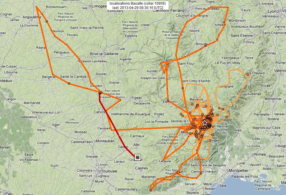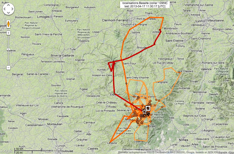 Il a continué sa boucle le lendemain, a passé la journée du 16/04 dans les reliefs du PNR des Volcans d’Auvergne, avant de redescendre dans les Grands Causses en fin de journée (retour sur le Causse Méjean (vers 16 h à proximité du site de lâcher).