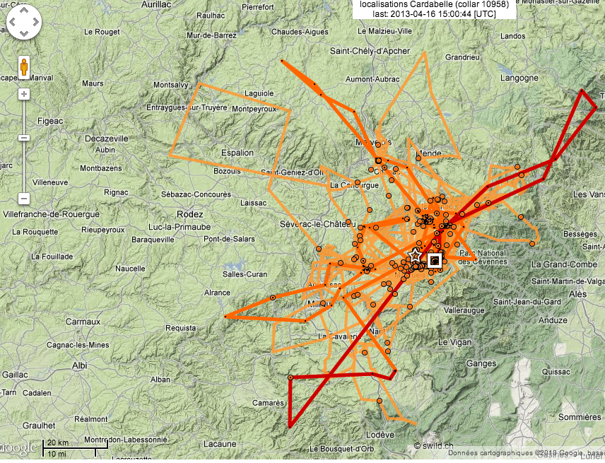 Cardabelle a également bien voyagé depuis quatre jours. Le 14/04, elle a traversé le Larzac (relevé GPS à l’Est de Camarès vers 12h) pour rejoindre en fin de journée les corniches Sud du Causse Méjean. Le lendemain, elle prenait la direction opposée et a visité les contreforts Nord des Cévennes. Elle a notamment été observée à Villefort mardi 16/04.