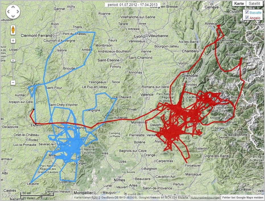 Une autre information très intéressante est à noter ! Angelo (en rouge), un des jeunes Gypaète lâchés dans le Vercors en 2012 se baladait dans le sud Massif central hier ! Le suivi GPS des oiseaux nous permet d’imaginer que sa route a peut-être croisé celle de Basalte (en bleu) à proximité d’Espalion (Aveyron) le 17/04 ! La connexion Alpes-Massif central est effective !