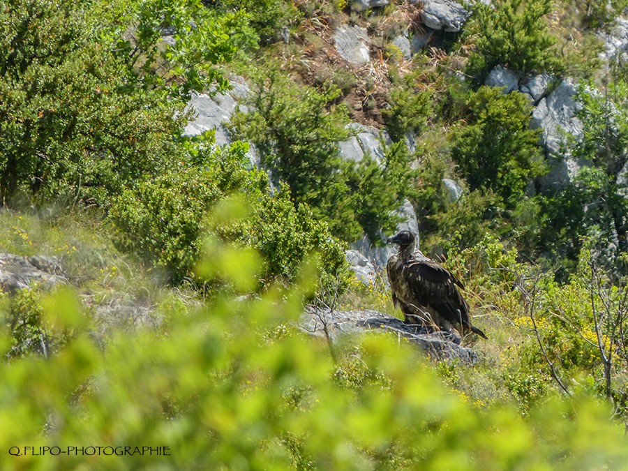 Le 4 juillet 2013 à 10h15, Dourbie a fait le grand saut ! Prenant son courage à deux pattes, notre jeune Gypaète a décidé de quitter la vire en franchissant la barrière de protection. Dourbie, qui n’était pas plus actif que d’habitude, s’est élancé dans le vide après quelques battements d’ailes, surprenant les deux surveillants. Après plusieurs minutes de recherche, le gypaète est enfin localisé, posé sur un rocher au milieu de la végétation. Très intrigué par ce nouveau monde, Dourbie a passé beaucoup de temps à observer son environnement. Celui-ci a tout de même effectué deux petits vols dans l’après-midi pour se poster sur des falaises en contre-bas. Après le départ de son compagnon, Layrou semblait très agité mais n’a pas osé quitter le confort de la cavité .