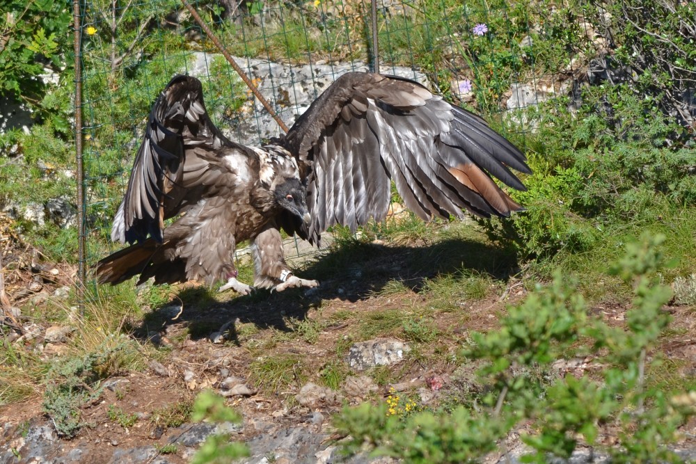 Vendredi 5 juillet 2013, vers 9h, nous avons retiré le grillage de protection qui se trouvait autour de la cavité pour faciliter la surveillance de nos 2 Gypaètes après l’envol de Dourbie.