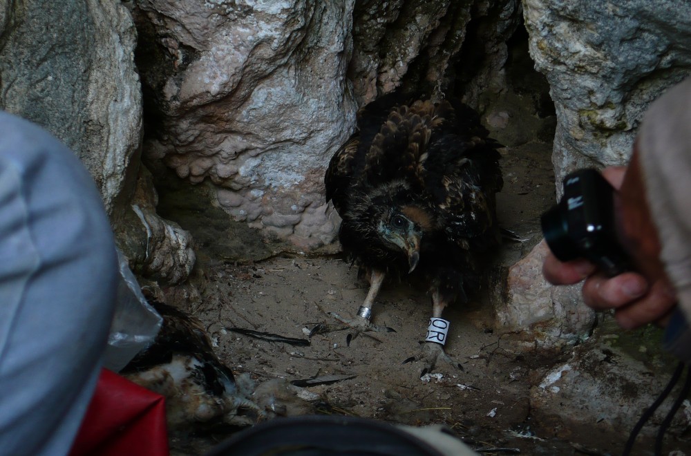 Le 11 juillet, munis cette fois de plus de matériel, la même équipe plus une troisième personne (Odile Couqueberg) tentait de nouveau l’aventure et parvenait cette fois-ci sans encombre à rentrer dans le nid. Les deux petits percnoptères étaient là, bien étonnés de cette visite matinale… Les deux poussins furent bagués et des restes de proies collectés.
