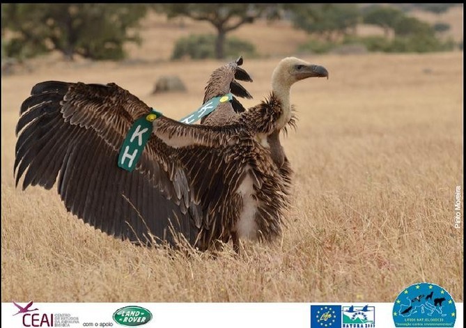 Après quelques recherche sur l’origine de cet oiseau, il s’avère qu’il s’agit d’un jeune vautour de Ruppell capturé affaibli au Portugal puis relâché (www.4vultures.org/news/).