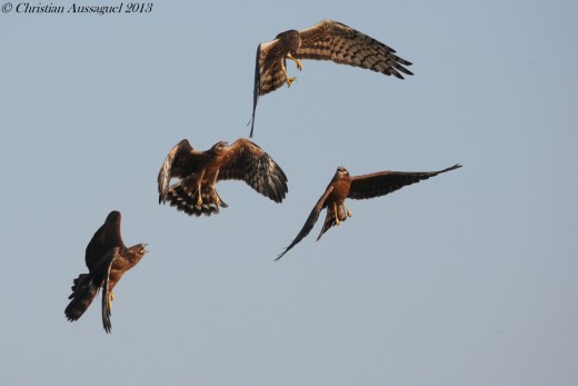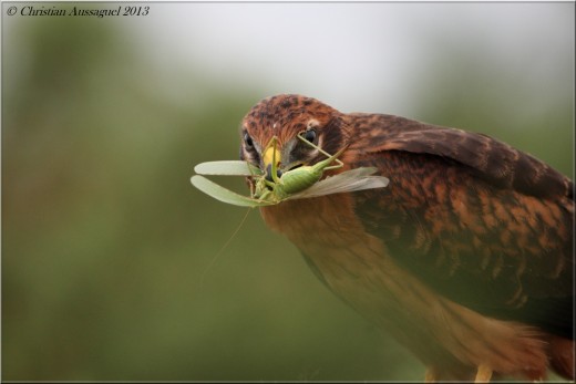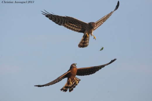 Fin juillet, aux confins du Tarn et de l’Aude, des jeunes busards cendrés ont pris leur envol dans une lande à genêts. Ces jeunes tout justes volants sont ravitaillés avec uniquement des grandes sauterelles vertes, localement abondantes à cette période. Les jeunes s’entrainent également à la chasse avec la capture de ces proies relativement aisées à saisir.