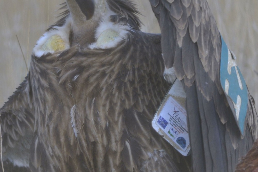 Dans la masse de Vautours, une tache bleue m’intrigue, c’est un individu marqué lui aussi, si les lettres KH sont bien visibles, j’ai du mal a déchiffrer les inscriptions au dos de la plaque plastique qui se soulève au gré des mouvements de l’oiseau, j’arrive enfin à la lire en partie, le marquage est Portugais !