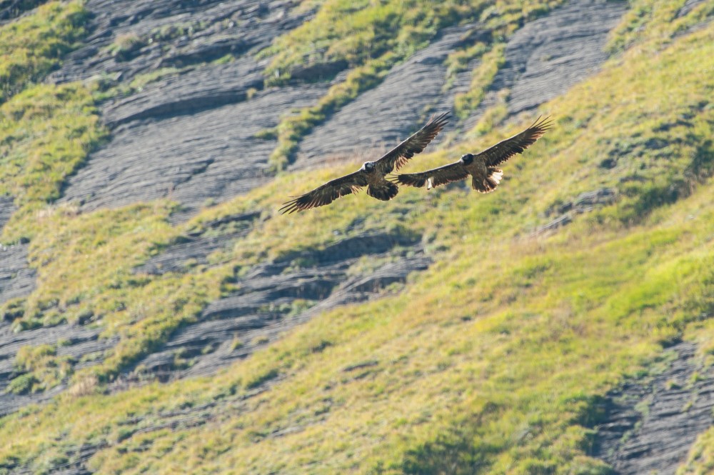 Les restes d’un cabri chamois sont retrouvés dans la pente. Pas étonnant que les deux Gypaètes barbus se soient attardés dans le secteur !Observation et photos: Cyril Doche