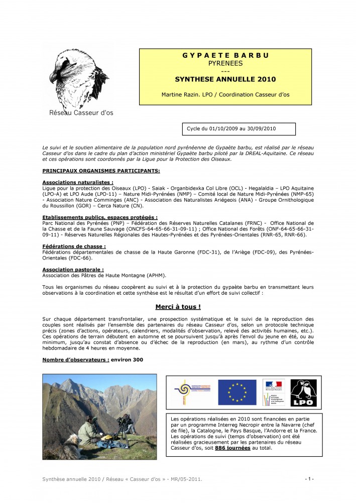 Ce document présente le bilan de la reproduction des gypaètes barbus en 2010 dans les Pyrénées françaises, de la synthèse des données de suivi au bilan des opérations de nourrissage spécifique en passant par les résultats de l’opération Vigilance Poison. Ce bilan a été réalisé dans le cadre du PNA gypaète piloté par la DREAL-Aquitaine, à partir des données collectées par le réseau de partenaires « Casseur d ‘os » coordonné par la LPO. Ce réseau est composé des associations naturalistes pyrénéennes (Saiak, Nature Midi-Pyrénées, Nature Comminges, Naturalistes de l’Arièges, Cerca Nature, Groupe ornithologique du Roussillon, LPO-Aude, etc.), des espaces protégés et d’établissements publics (Parc national des Pyrénées, Fédération des Réserves naturelles catalanes, ONCFS, ONF, etc.) et de bien d’autres structures.