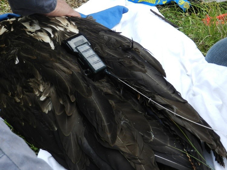 La balise, est fixée, avant l’envol des oiseaux, sur leur dos à l’aide d’un harnais.