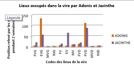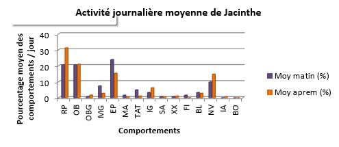 Ces analyses, permettent de constater des différences (temps moyen des types d’activités) ainsi que des similitudes (tendance des comportements) entre Adonis et Jacinthe, sur un certain nombre de points comportementaux.