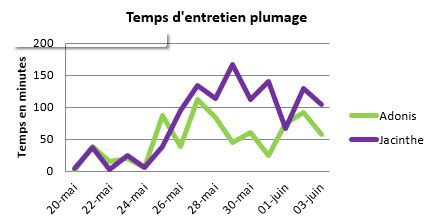 En effet, l’excellent état de celui-ci est une condition indispensable au vol des grands rapaces. D’après la figure ci-dessous, nous pouvons voir que, chaque jour, nos deux gypaètes y consacrent plusieurs heures ; Jacinthe y passe davantage de temps qu’Adonis.