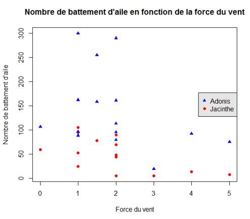 Nous nous sommes intéressés à l’influence de la force du vent et à la direction du vent sur leurs battements d’ailes (cf. Figure 2). La force du vent étant représentée de 0 (vent nul) à 5 (vent extrêmement fort). On remarque que les deux oiseaux ont un grand nombre de battements d’aile lorsque le vent est faible à moyen. Ceux-ci sont peu nombreux si le vent est absent ou avec de fortes rafales.